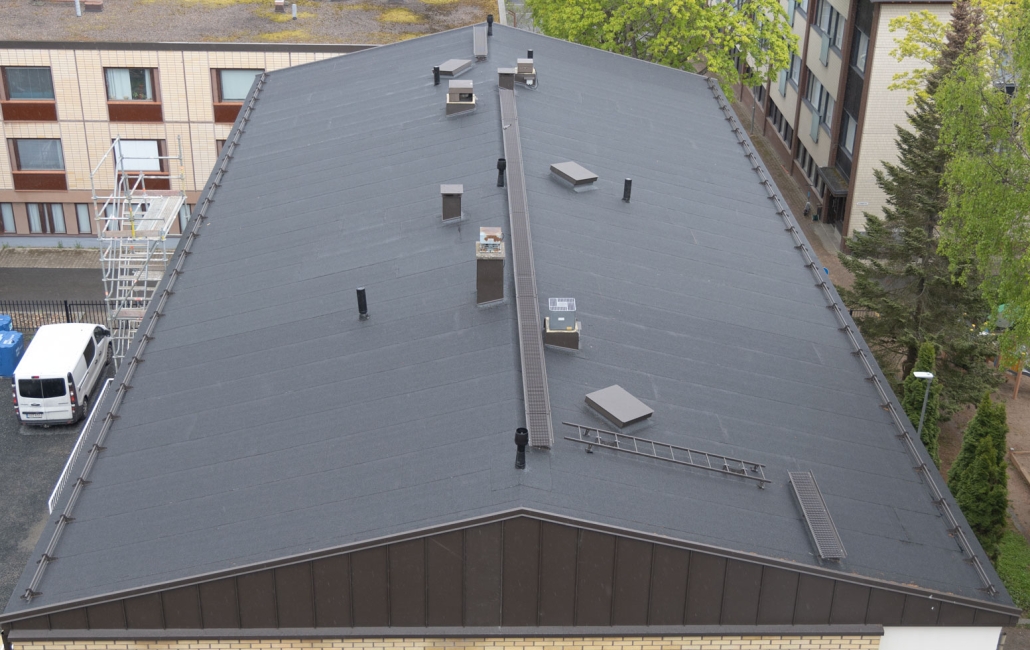 Vanha peltikate purettiin ja muutettiin kermikatteeksi. Kohteeseen asennettiin uusi alusvaneri, jonka päälle kaksinkertainen bitumikermikate. Lisäksi asennettiin kattoturvatuotteet ja sadevesijärjestelmät.