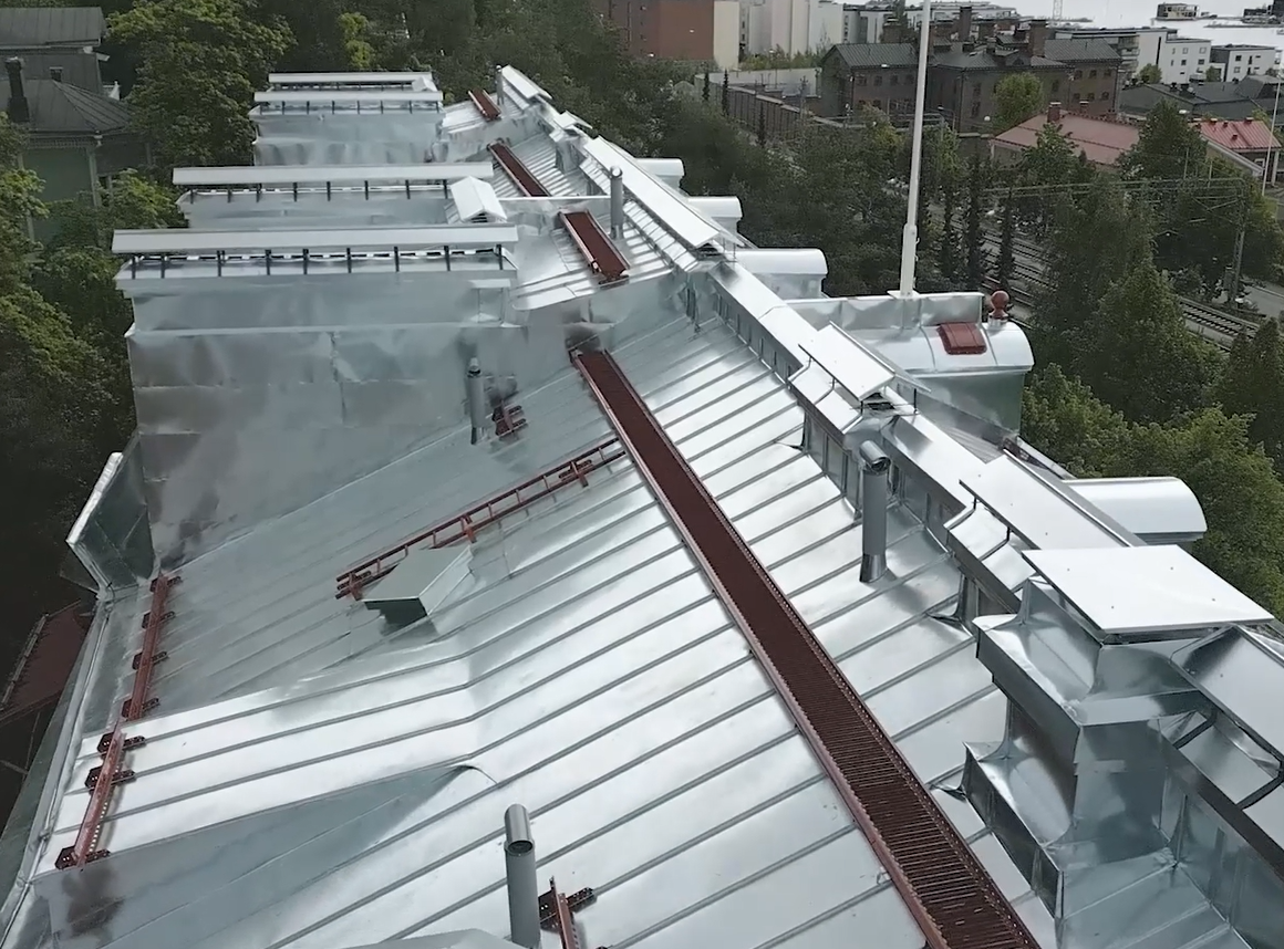 Mittava ja haastava kohde, jossa purettiin 100 vuotta vanha käsin saumattu sinkkipeltikatto. Lahovaurioita korjattiin ja alustaksi asennettiin vanerointi, alushuopa ja lopuksi konesaumattu sinkkipeltikate sekä nykyaikaiset kattoturvatuotteet.
